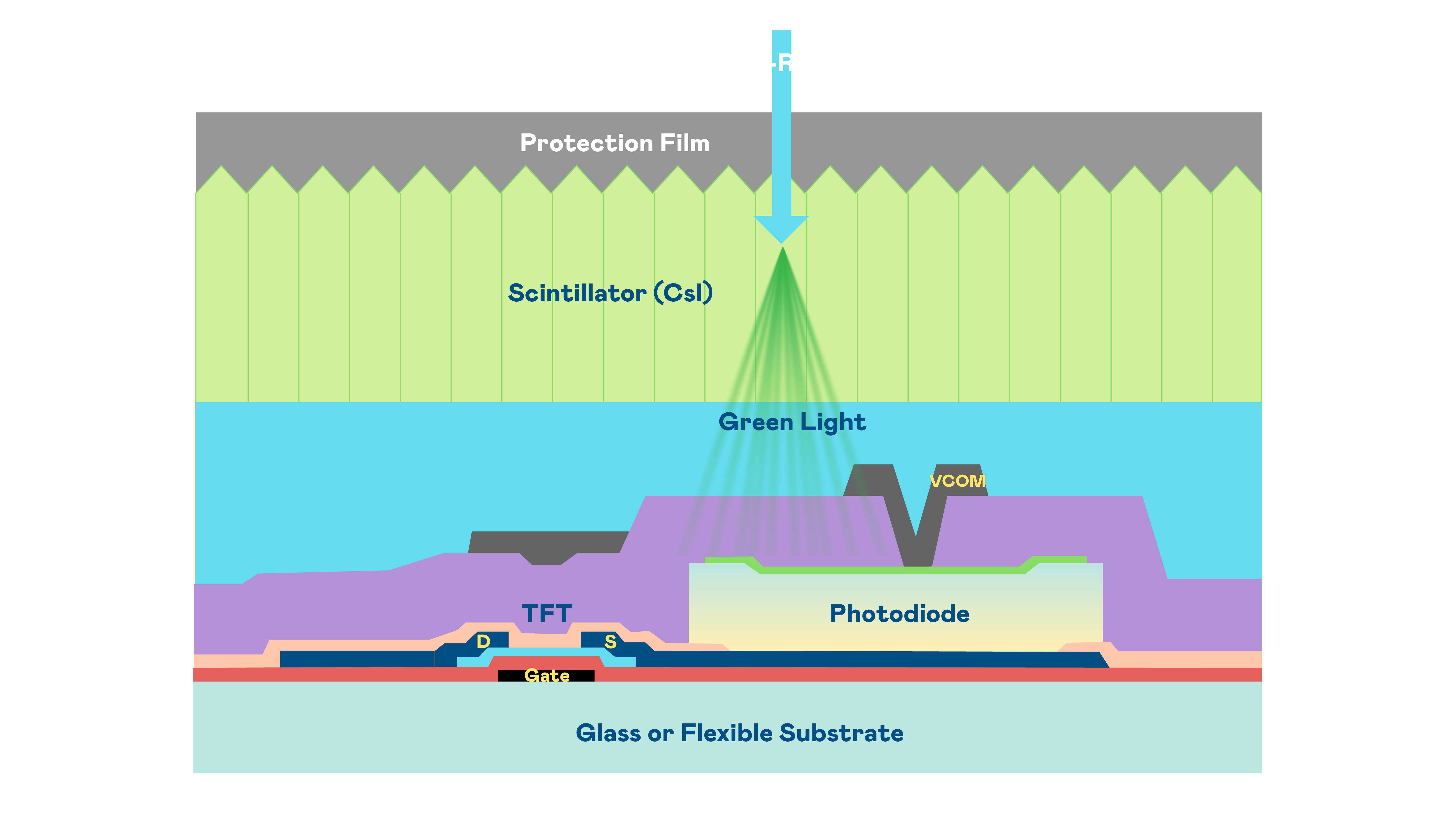 AG亚游集团的X光影像感测阵列使用薄膜电晶体 (TFT) 作为每个像素的读取开关,搭配光电二极体(Photodiode)的光电转换元件,用以感测X光影像讯号。